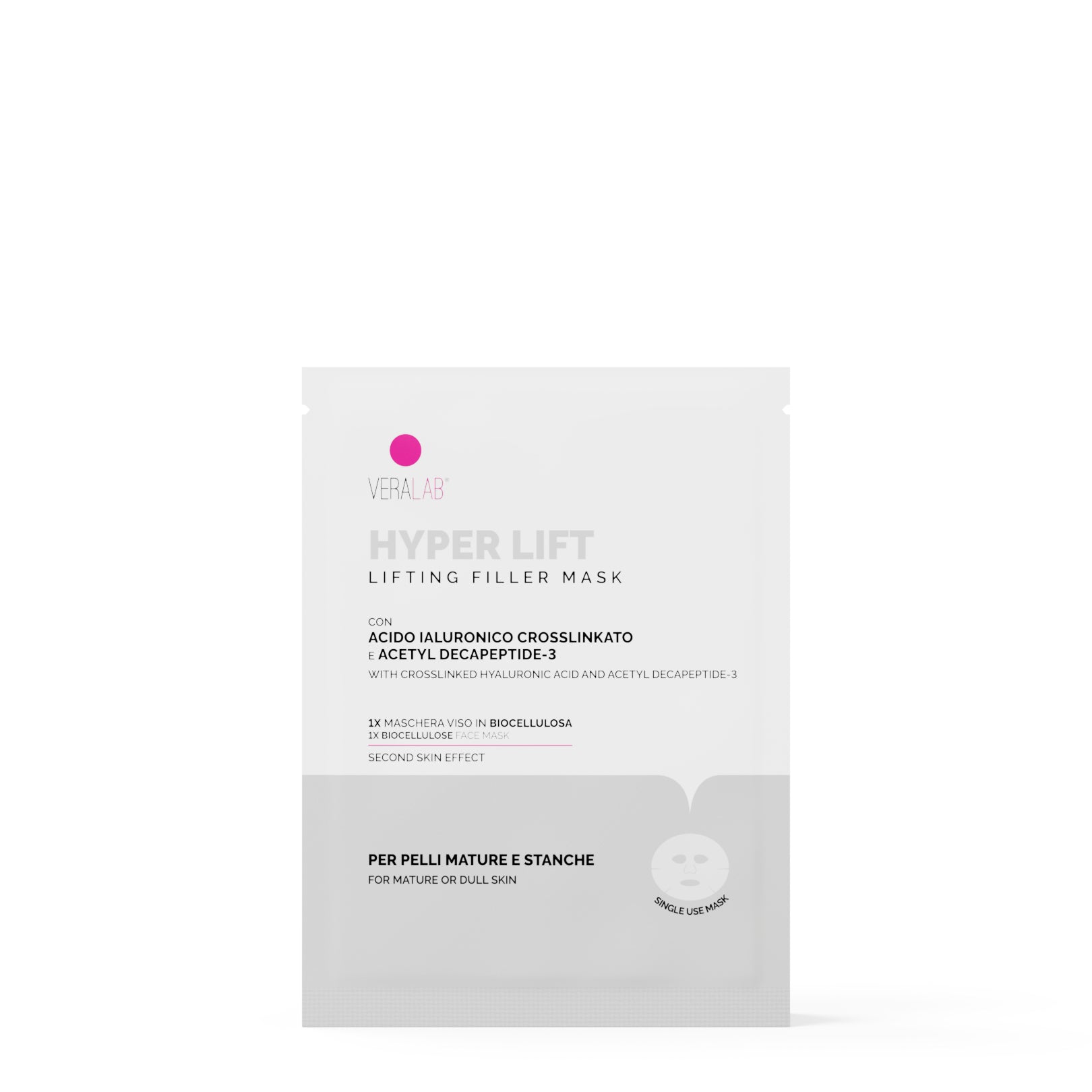 Maschera viso rimpolpante, liftante e antiage in biocellulosa effetto "seciind skin" dal grande potere elasticizzante in grado di ridurre le rughe visibili già dal primo utilizzo.