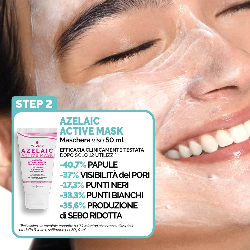 Duo esfoliante ad azione intensiva, studiato per affinare la grana della pelle, ridurre le imperfezioni e attenuare visibilmente le macchie post-infiammatorie. Agisce in modo mirato sulle principali problematiche della pelle impura grazie alla sinergia di due attivi chiave:• Acido Salicilico (More Pure): affina la grana della pelle e aiuta a ridurre pori visibili, lucidità e imperfezioni.• Acido Azelaico 10% (Azelaic Active Mask): svolge un’azione esfoliante e riequilibrante, contribuendo a ridurre papule, punti neri, punti bianchi, produzione di sebo e segni post-infiammatori dopo soli 12 utilizzi.