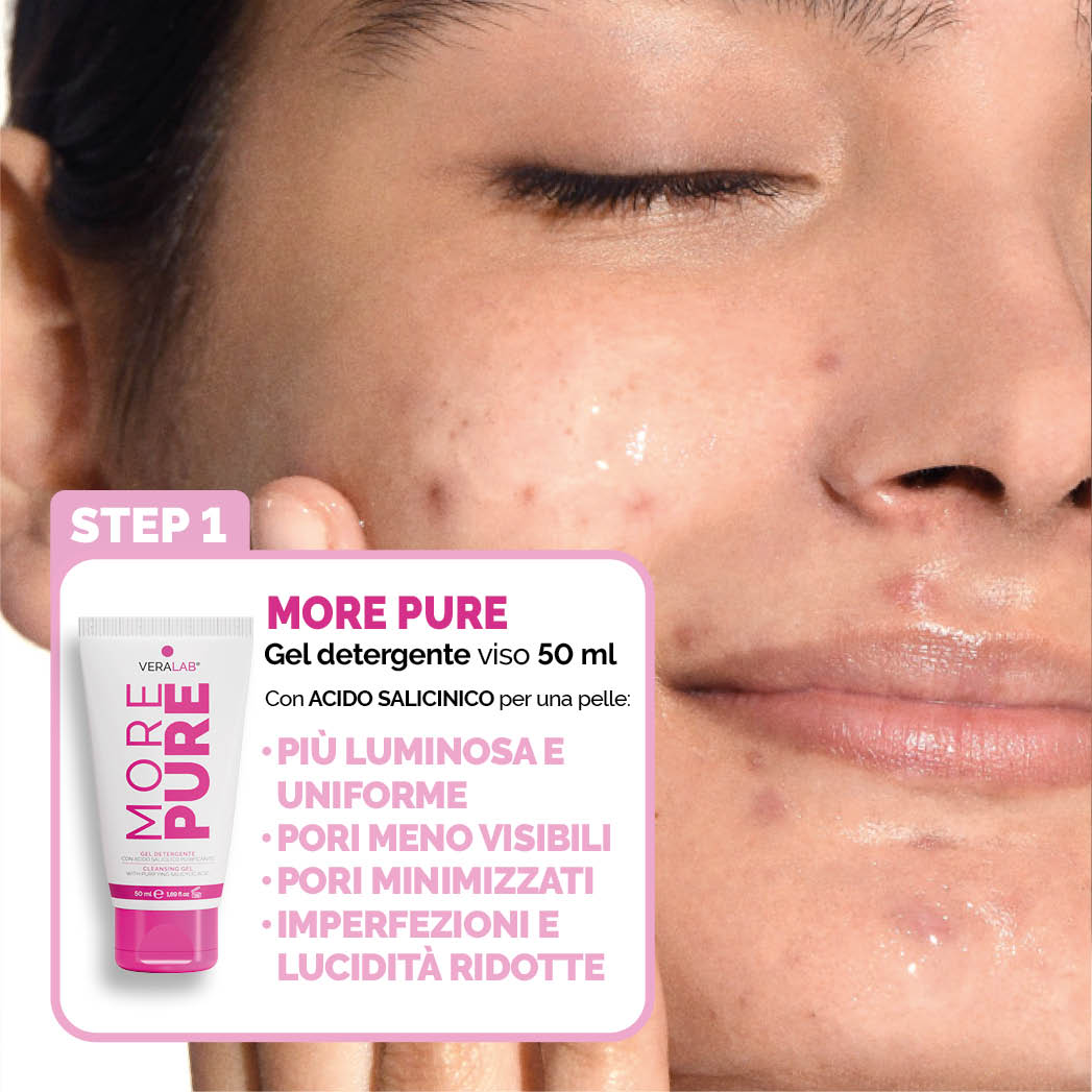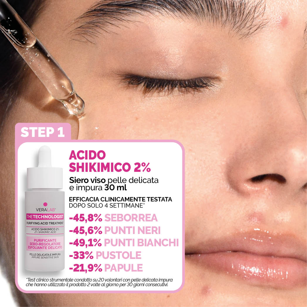 Duo esfoliante delicato ad azione purificante, studiato per detergere e trattare la pelle impura contribuendo a ridurre il sebo in eccesso, nel rispetto dell’equilibrio cutaneo. Aiuta a contrastare le problematiche della pelle mista e grassa grazie alla sinergia di due attivi chiave:• Acido Salicilico (More Pure): affina la grana della pelle e aiuta a ridurre pori visibili, lucidità e imperfezioni.• Acido Shikimico 2%: svolge un’azione levigante delicata e anti-imperfezioni, contribuendo a ridurre sebo in eccesso, punti neri, punti bianchi e pustole dopo sole 4 settimane.